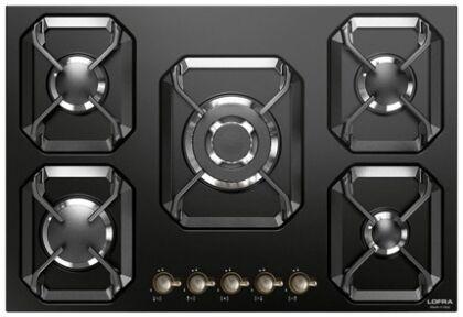 Варочная газовая панель Lofra встраивается в столешницу. Модель принадлежит серии Dolcevita: плоская эмалированная поверхность покрашена в черный цвет, на панели управления бронзовые поворотные переключатели. Вы готовите на 5 конфорках, одна из которых повышенной мощности, одна — экономичная.