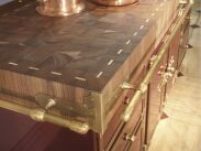Газовая плита с электрической духовкой, оснащенной грилем, с бронзовой фурнитурой.