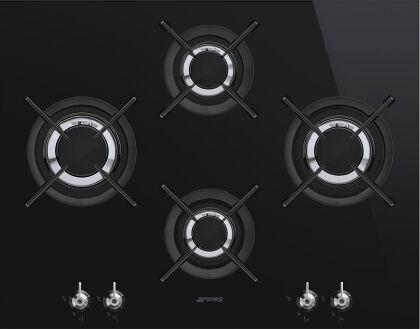 Варочная поверхность Smeg «газ на стекле» с автоматическим электроподжигом. Поворотные переключатели выполнены с эффектом нержавеющей стали.